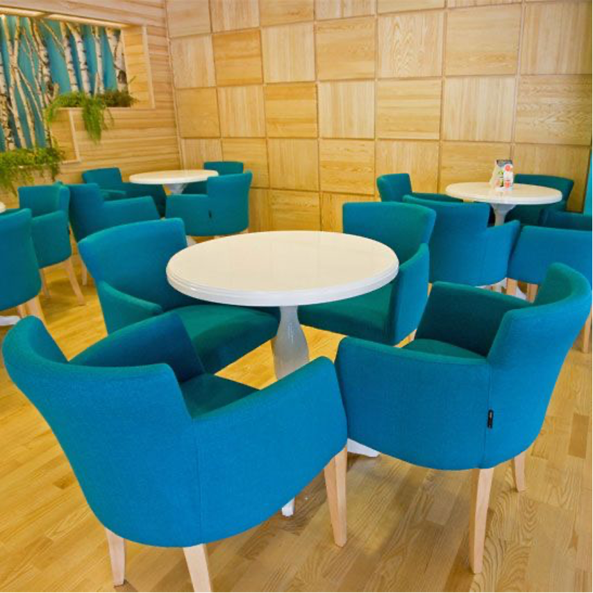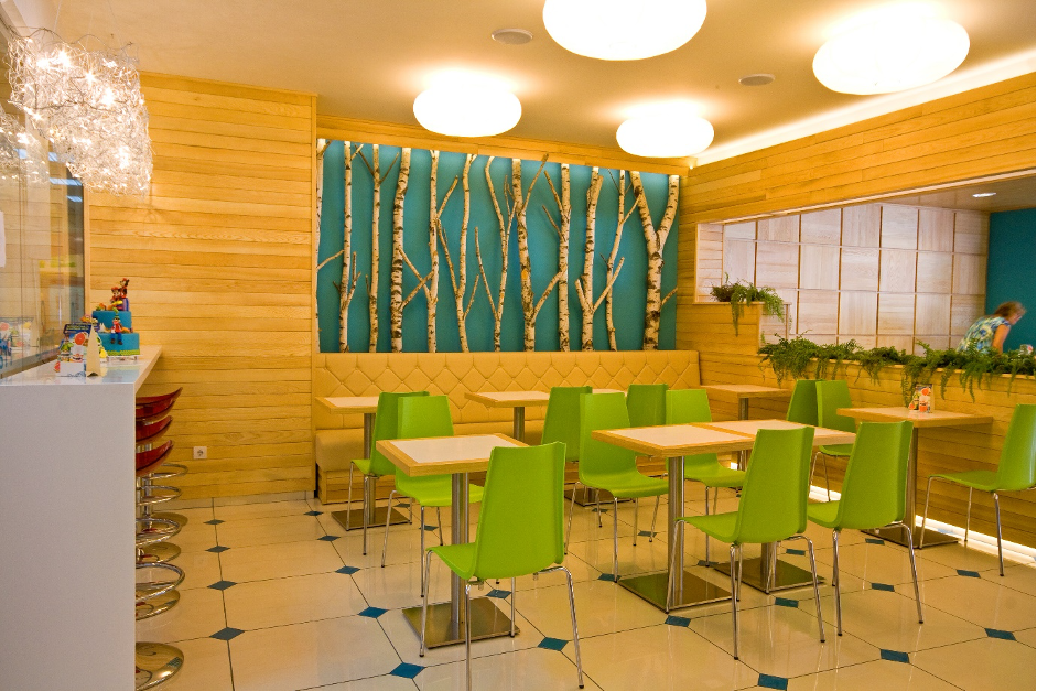 Design-ul adoptat este unul încântător prin gama de culori aleasă, culorile vii ale scaunelor, și original datorită zonelor de piedestal cu lemn masiv de frasin. Acest decor creează o atmosferă extrem de plăcută.